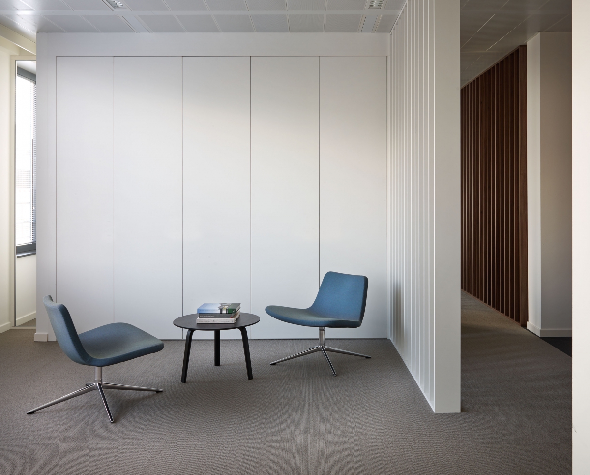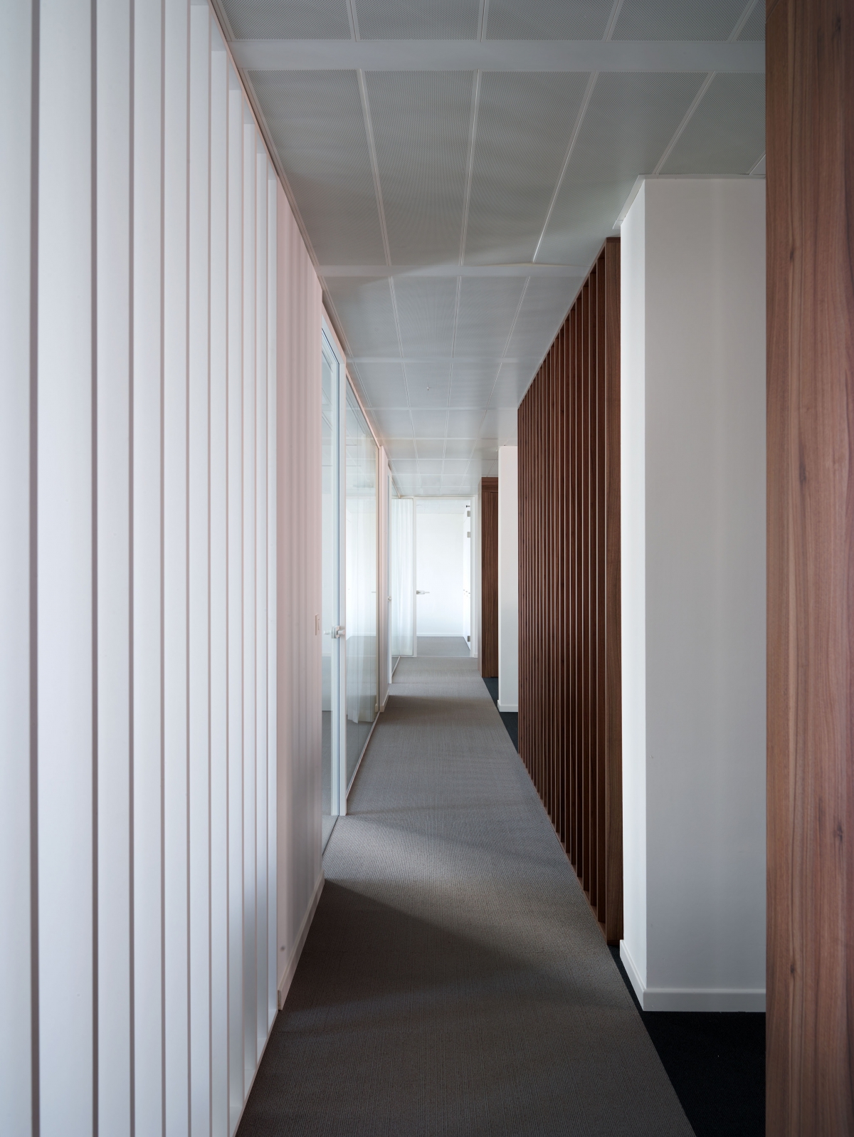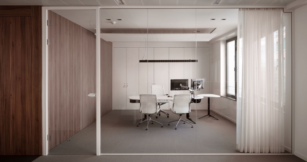 The combination of open and closed volumes, creates reception areas, meeting rooms and private work stations.