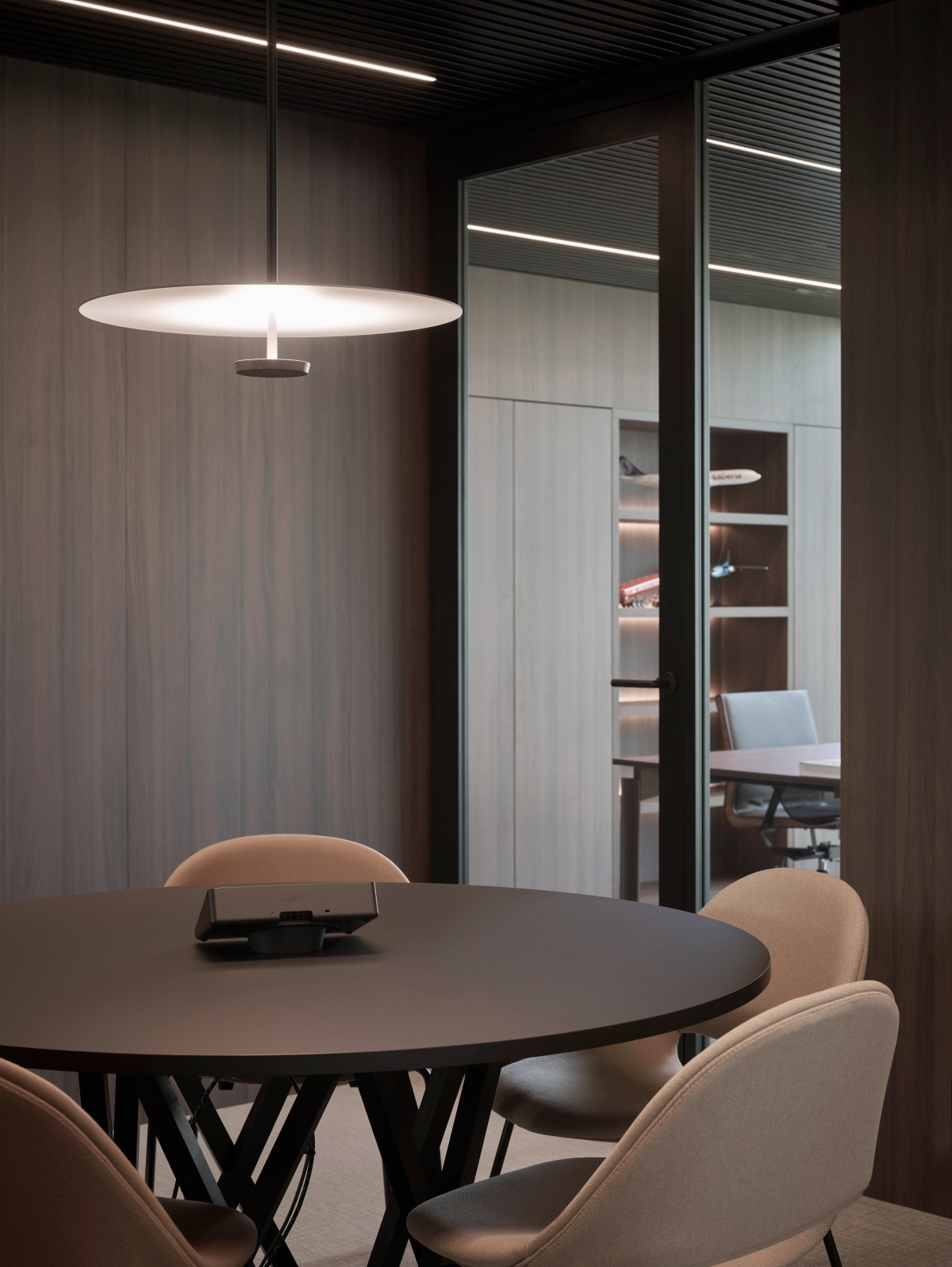 In terms of atmosphere and materialization, a warm appearance was chosen with a subtle balance between comfort and professionalism. The choice of soft colors and natural materials such as wood and textiles creates a soothing working environment, while clean lines and carefully placed lighting give the space a refined appearance. The integration of green accents strengthens the connection with nature and brings freshness to the space.