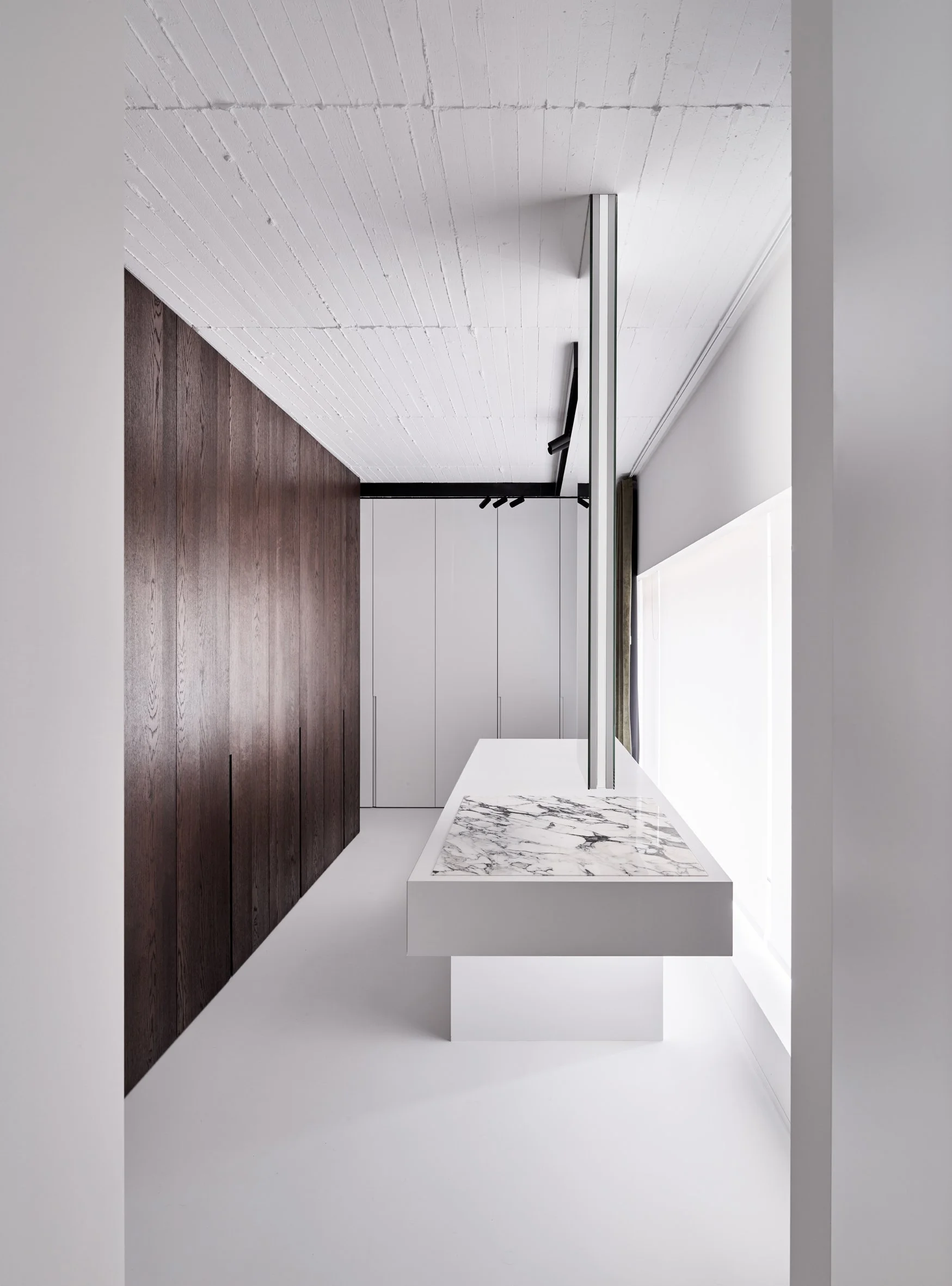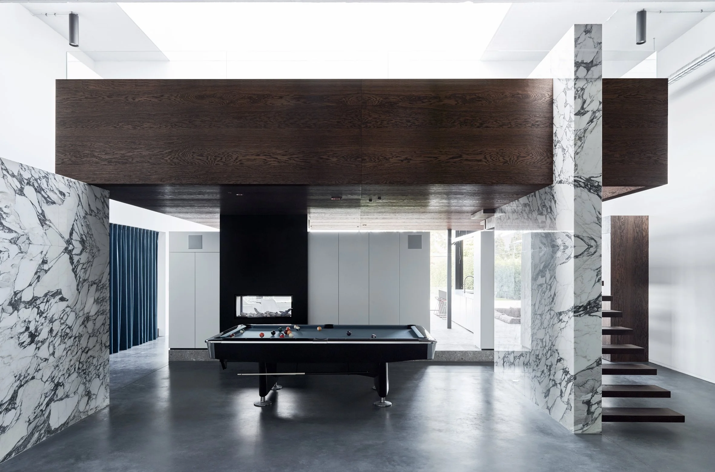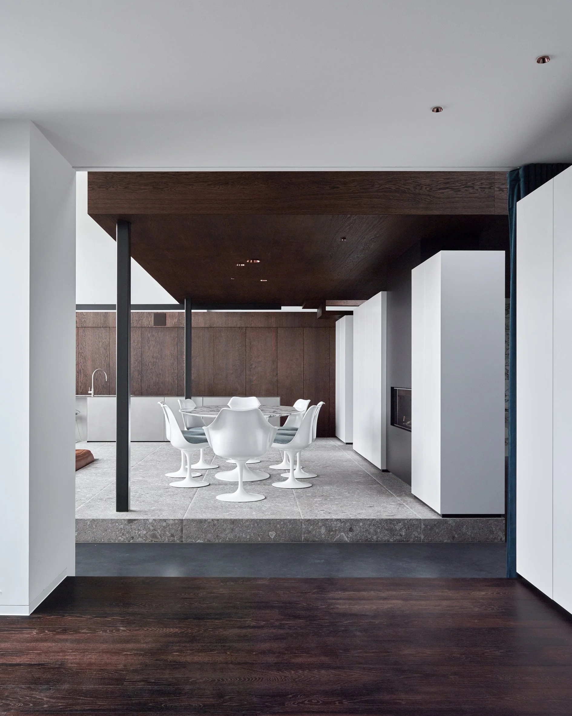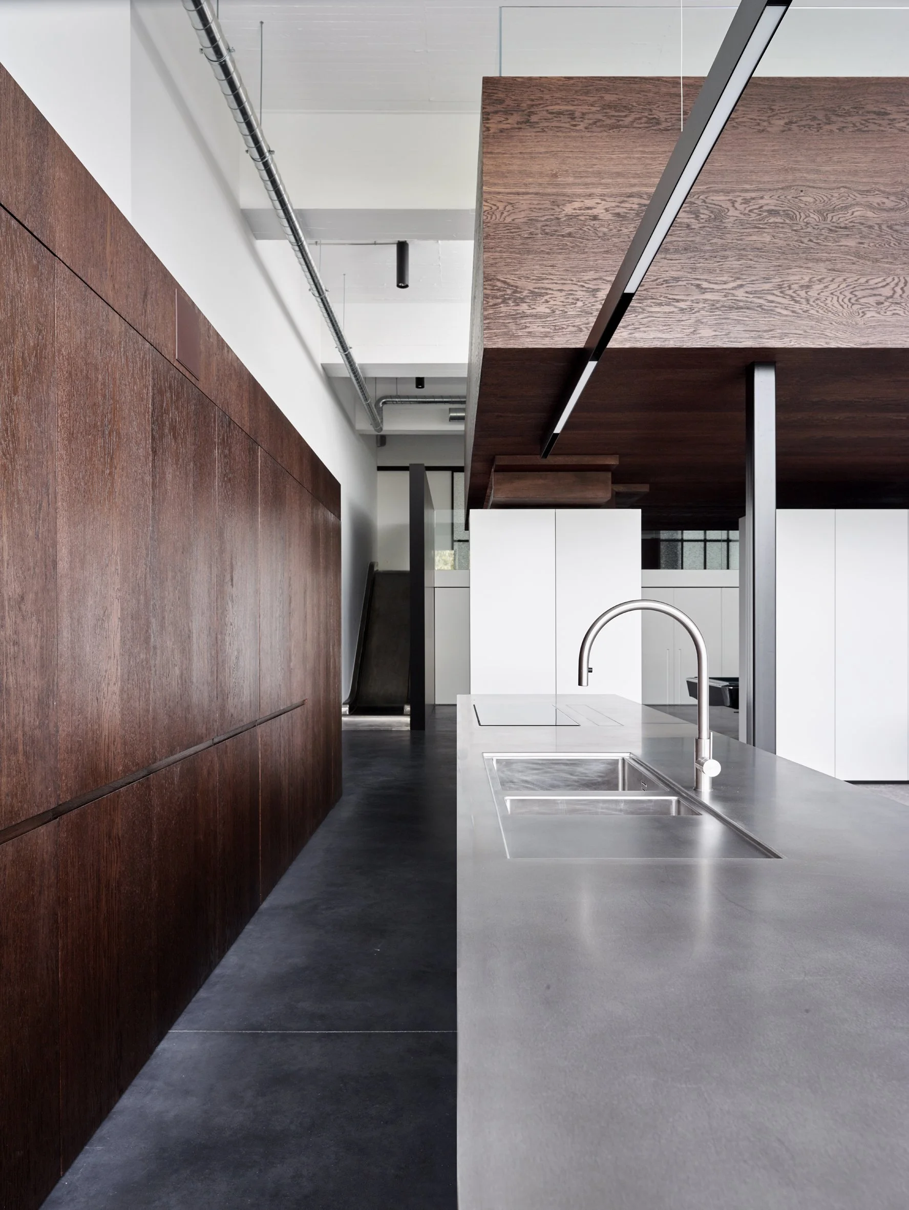 Integratie van een paviljoen in een industriële ruimte. De belangrijkste woonfuncties werden in, op en rond het volume geplaatst.