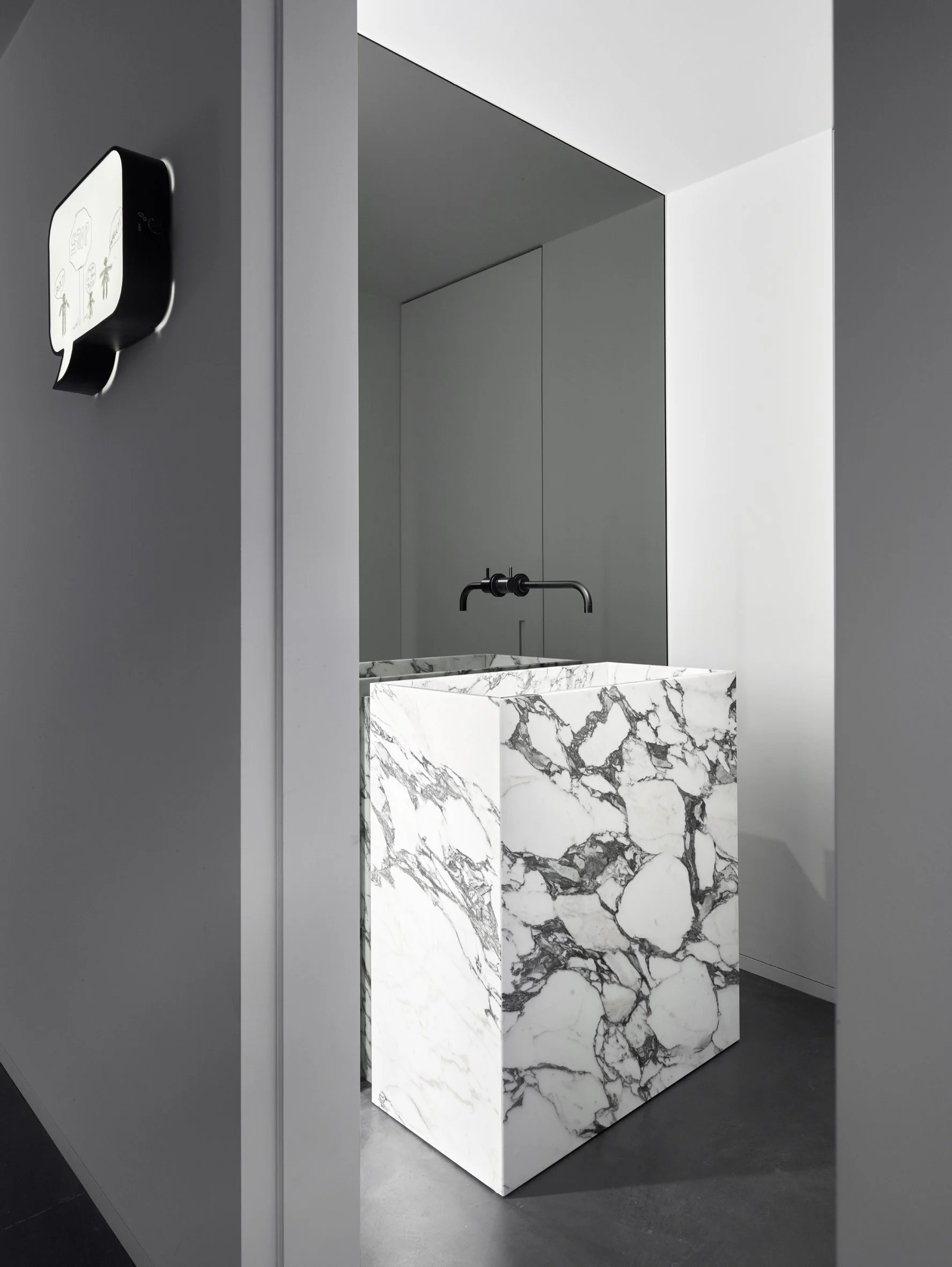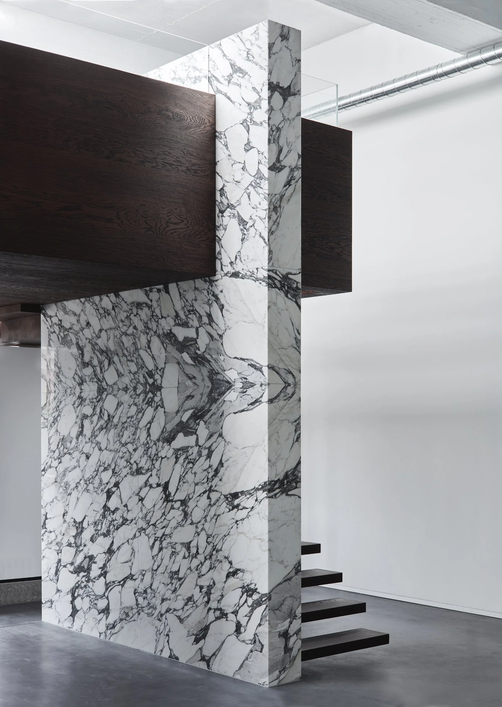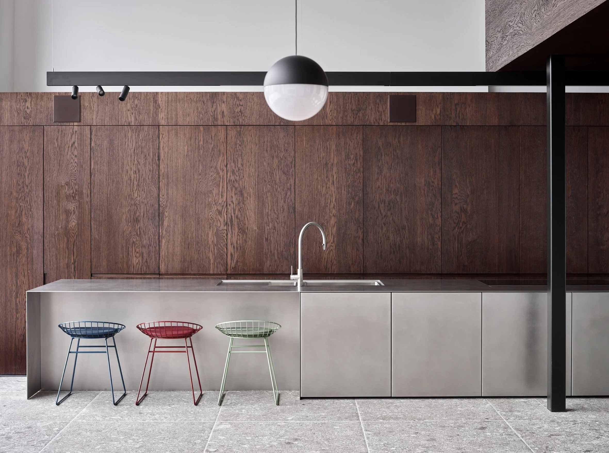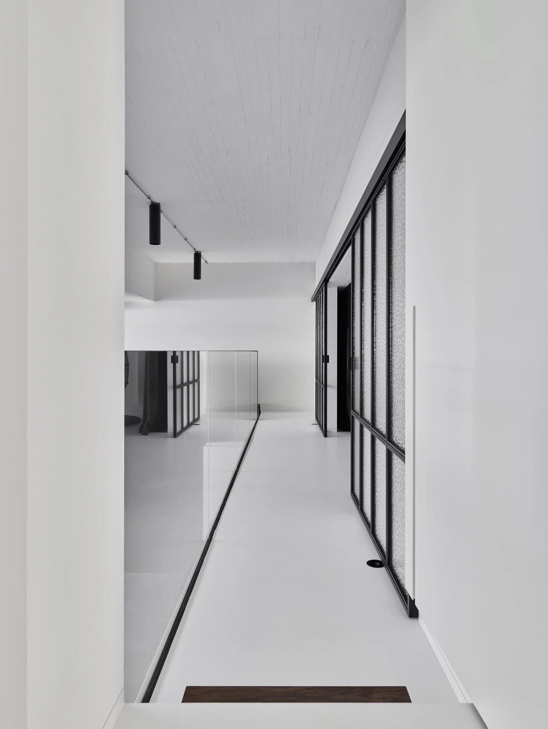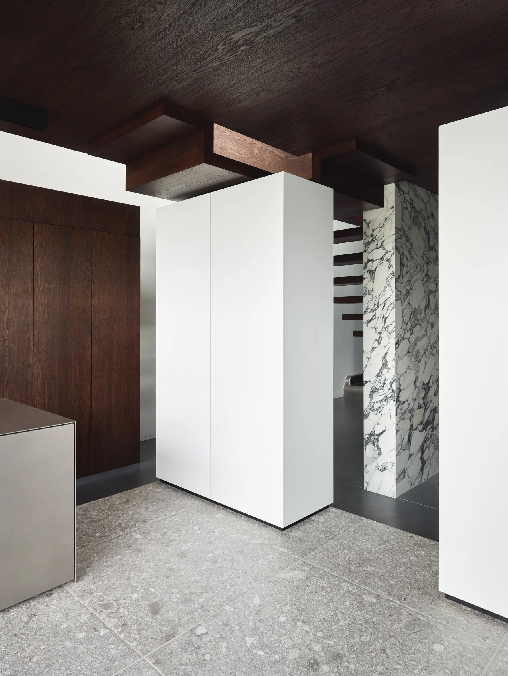Integratie van een paviljoen in een industriële ruimte. De belangrijkste woonfuncties werden in, op en rond het volume geplaatst.