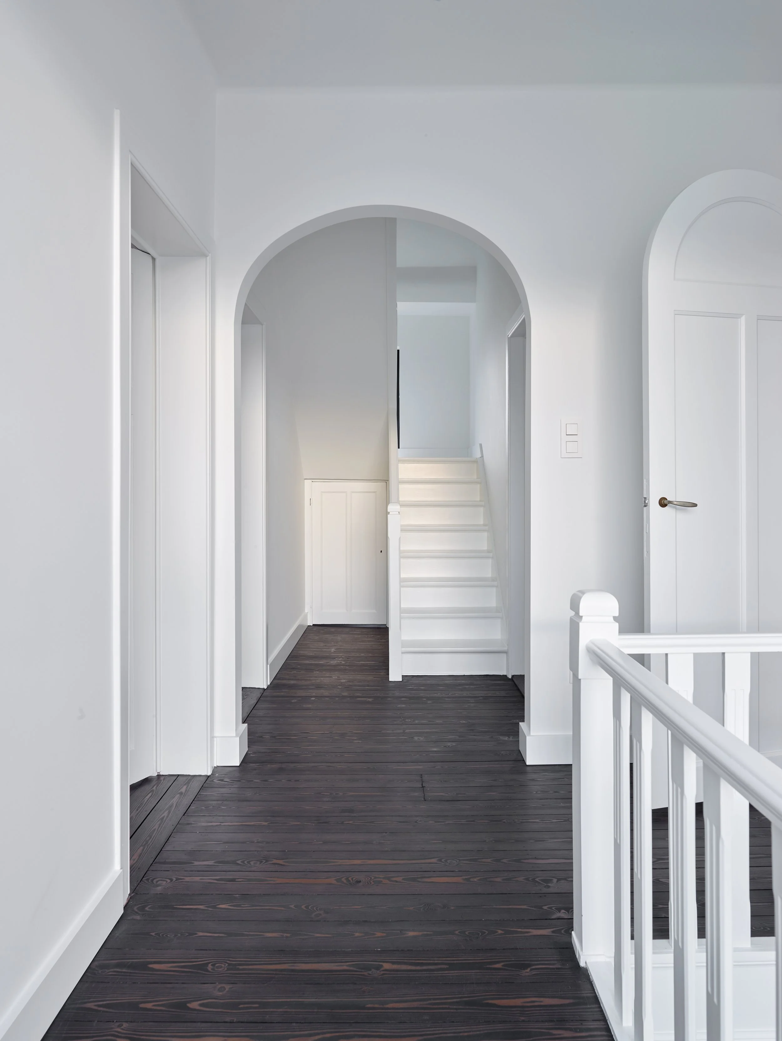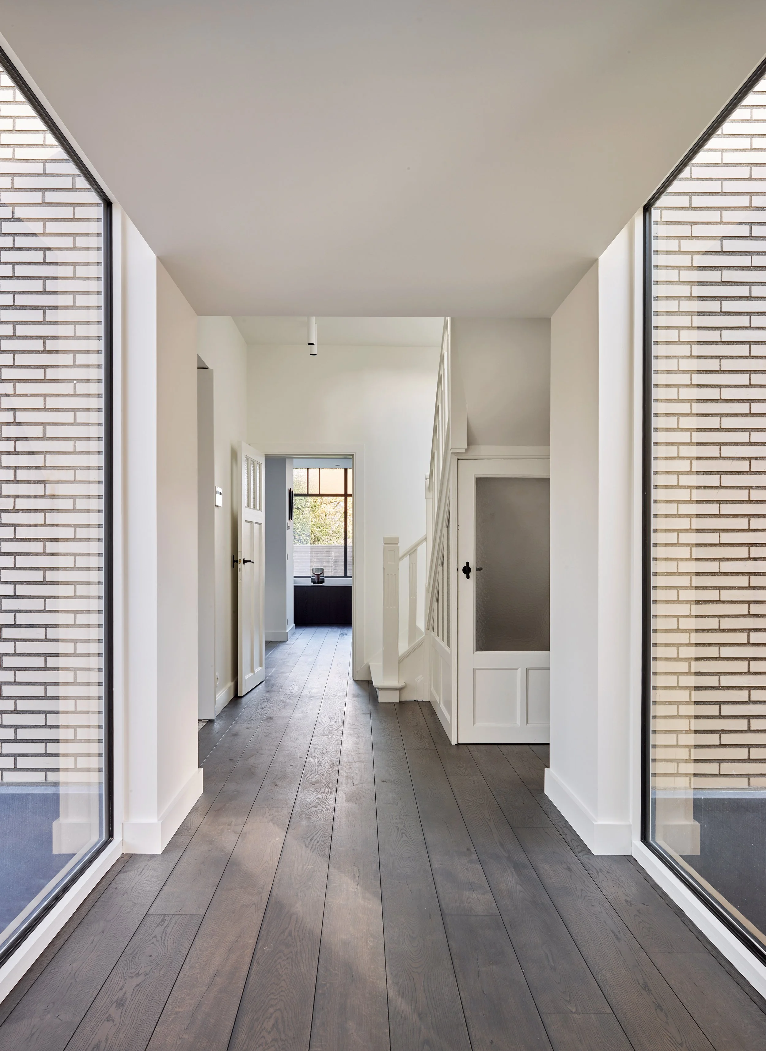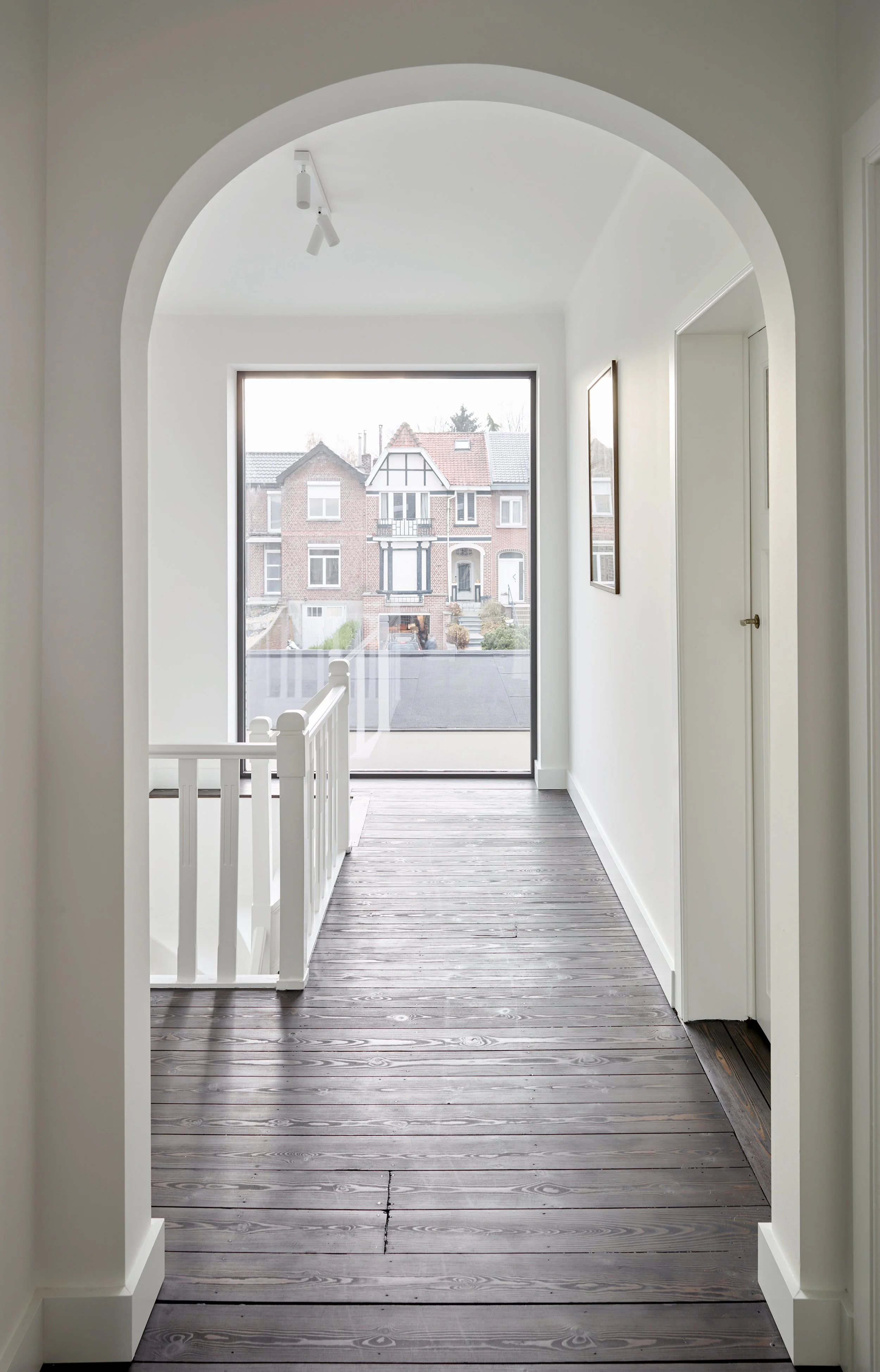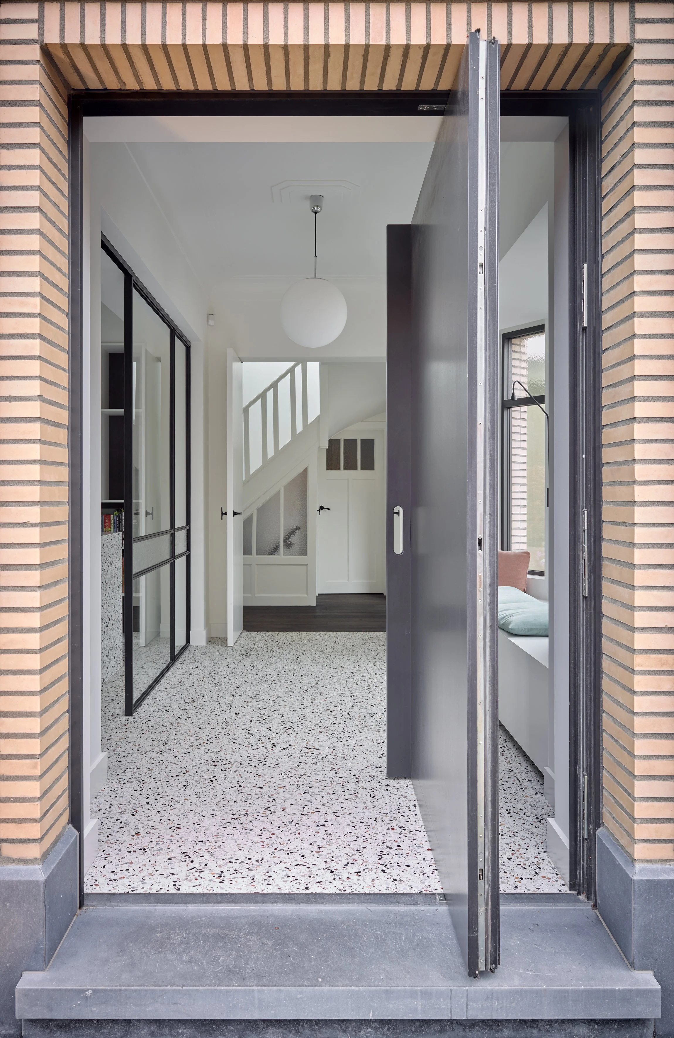 Een enorme pivoterende deur verwelkomt je in deze prachtige villa. De woning werd uitgebreid met een aanbouw waarin de nieuwe leefruimte is ondergebracht. De protagonist van dit ontwerp is de originele gele baksteen.