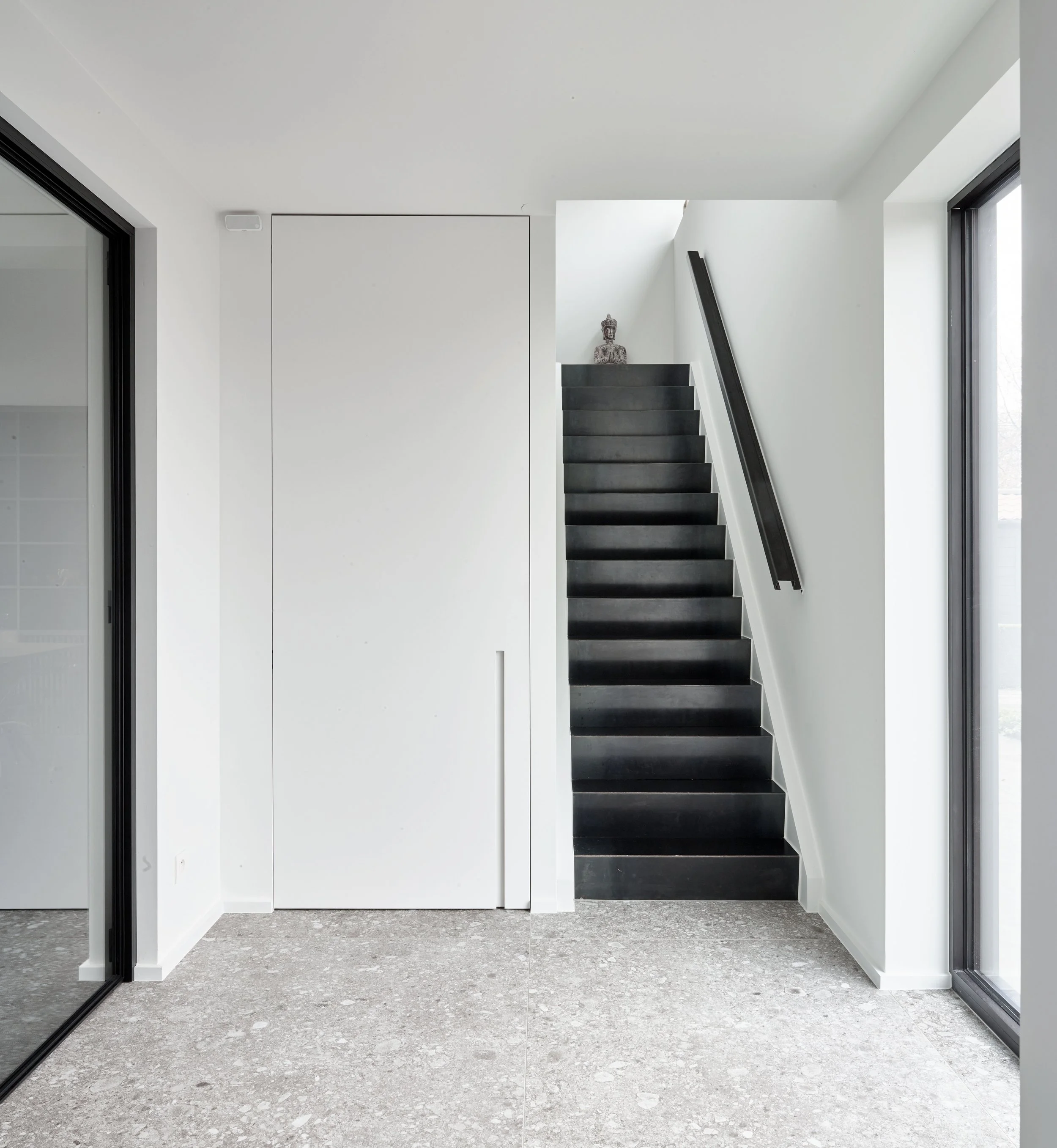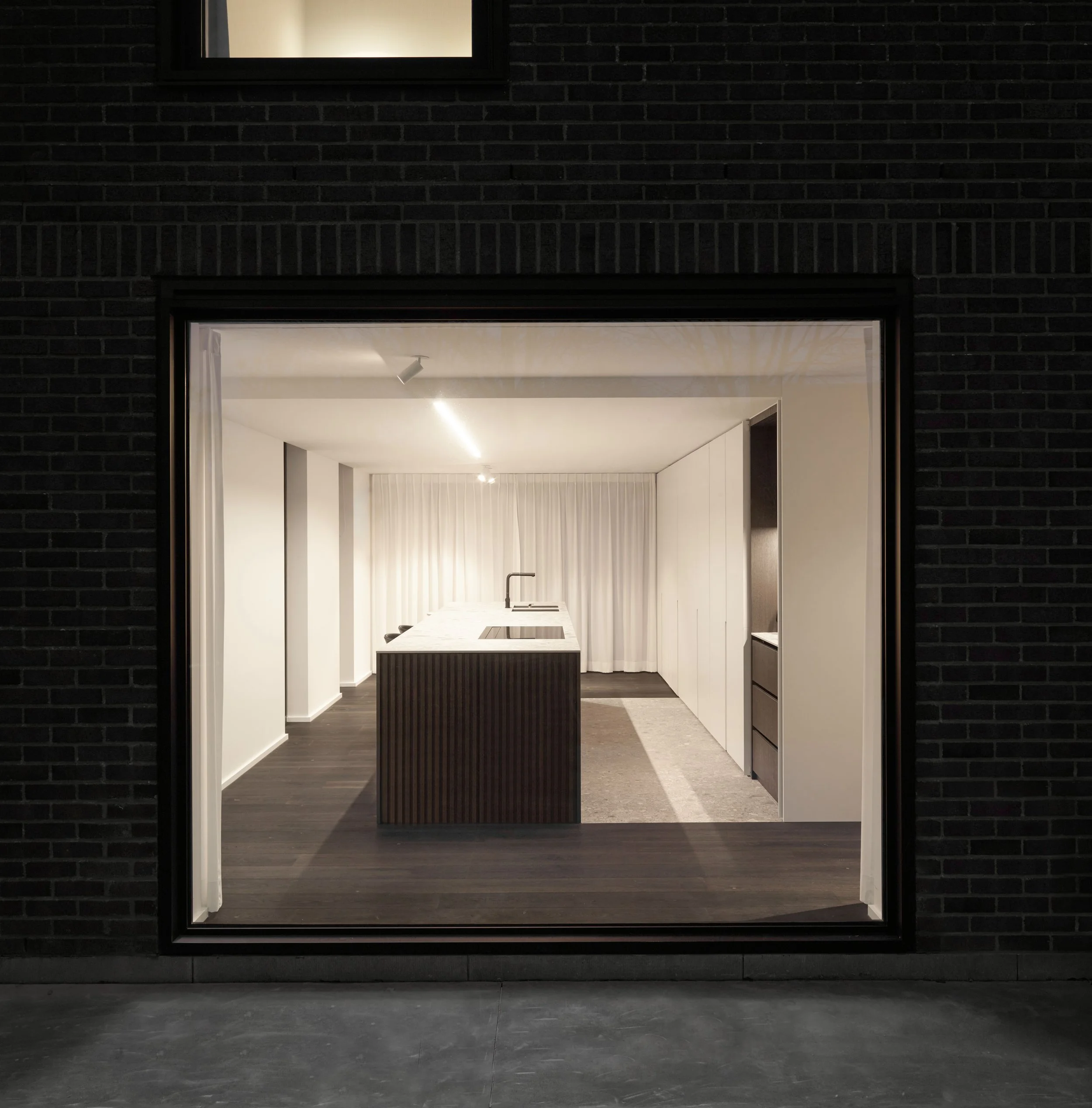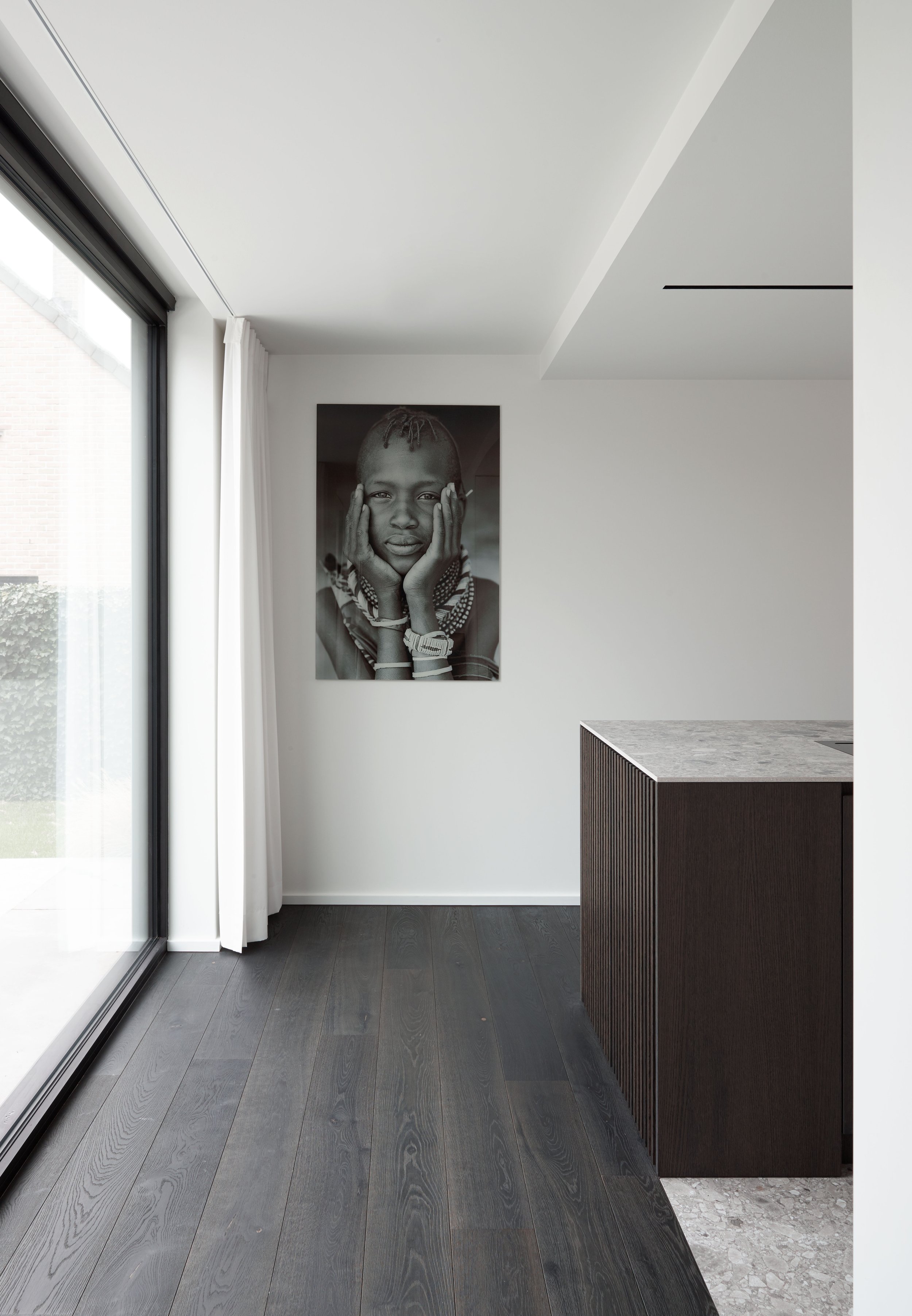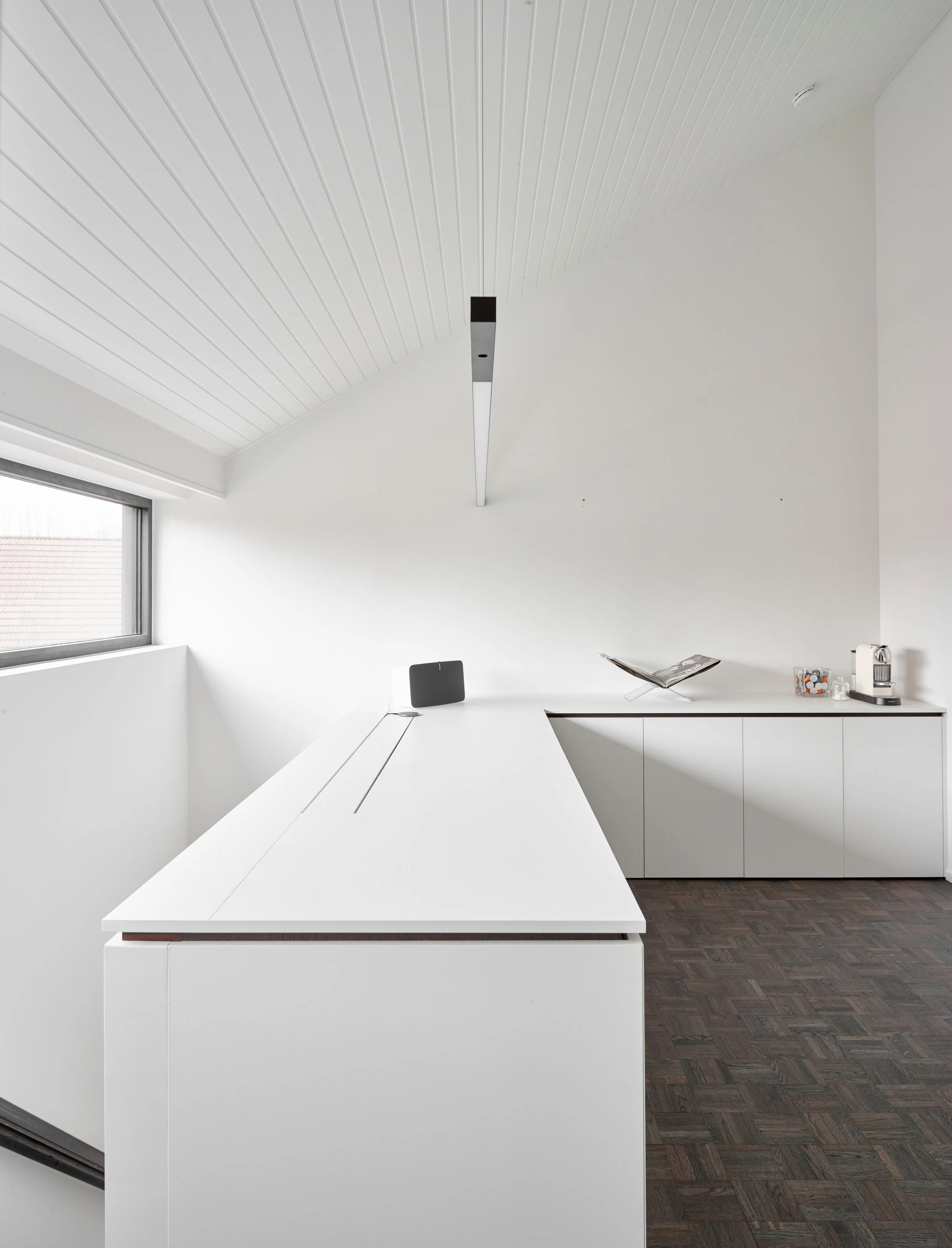 Renovatie van een gezinswoning waarbij de leefruimte het hart van de woning vormt. Deze centrale ruimte wordt gekenmerkt door warme houtaccenten en is omgeven door dagelijkse functies zoals de keuken, werkruimte en slaapkamers.