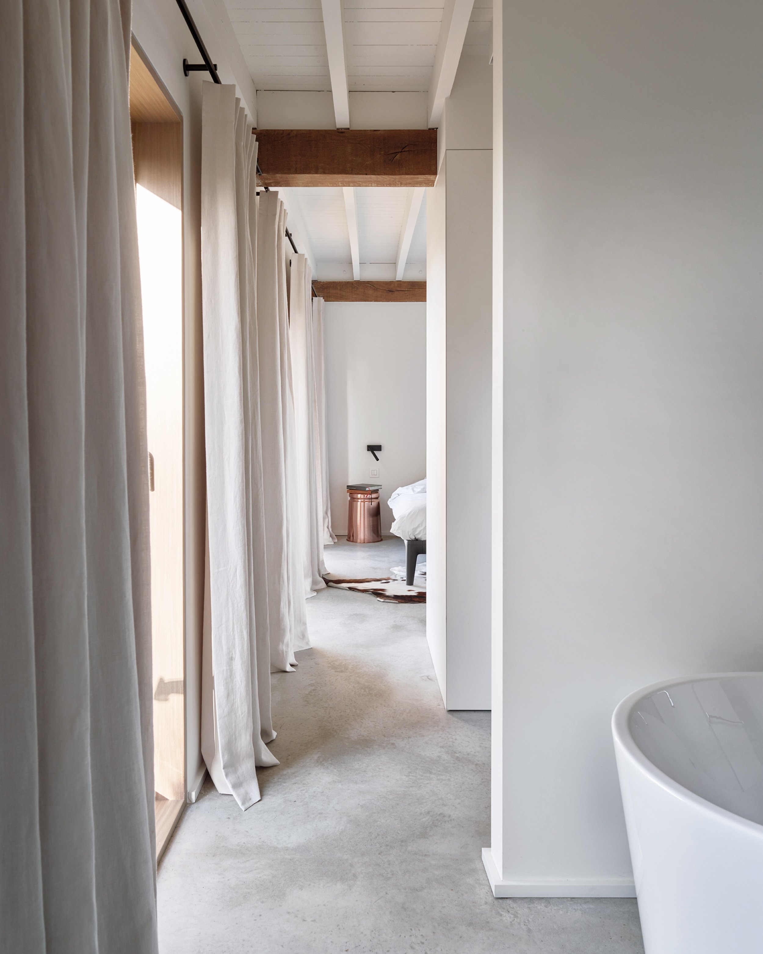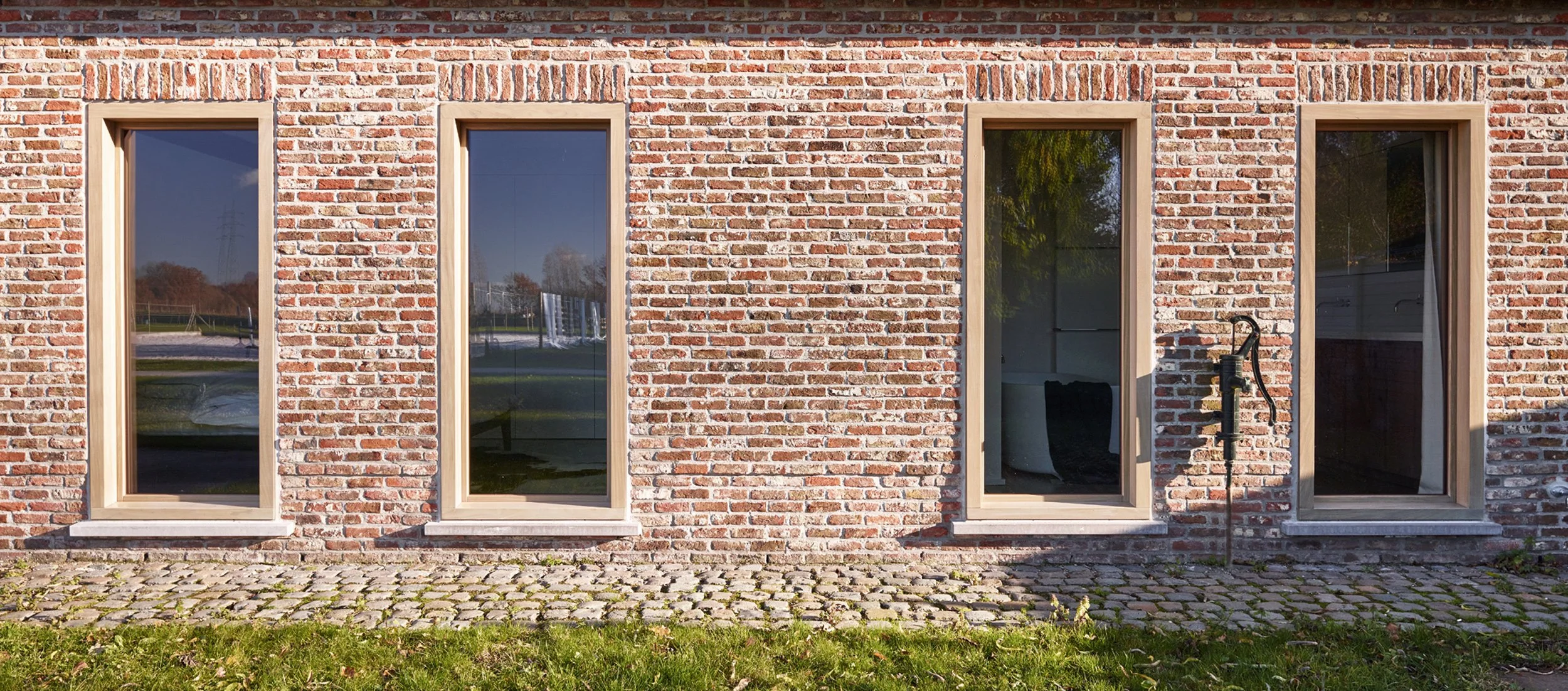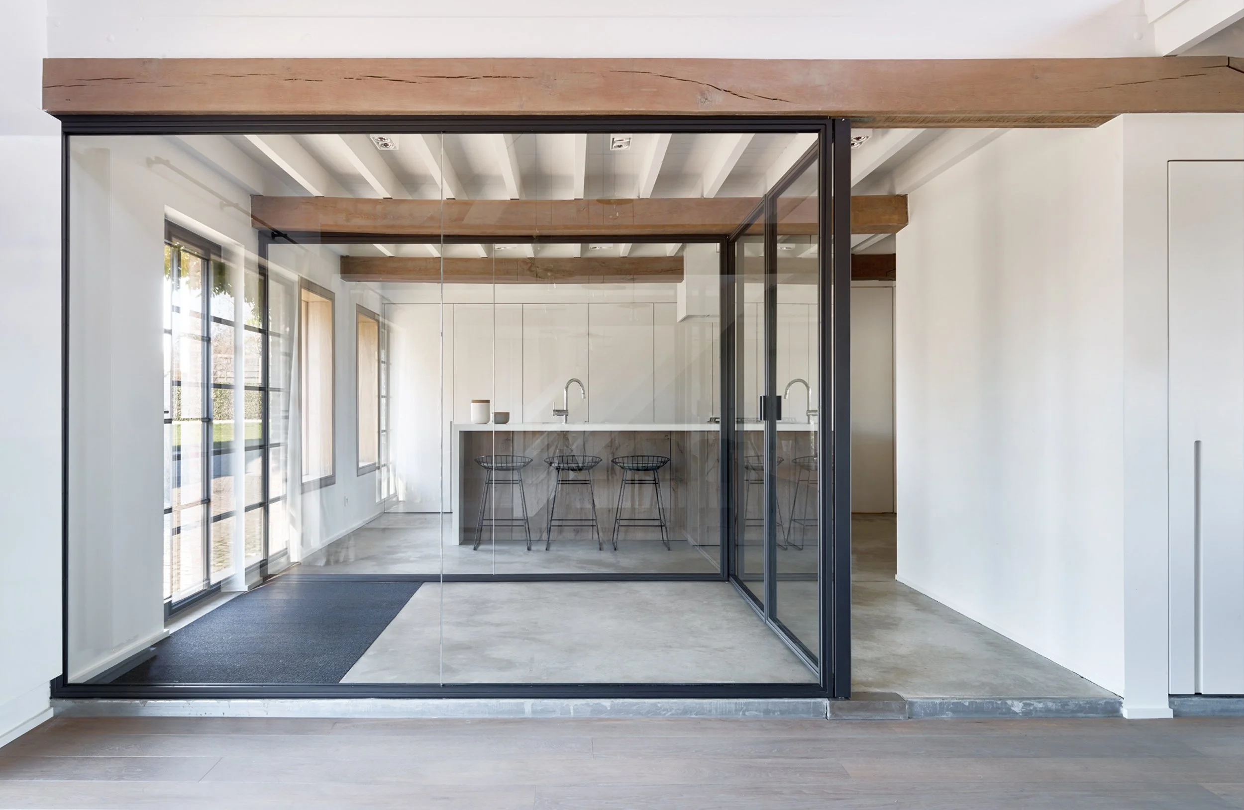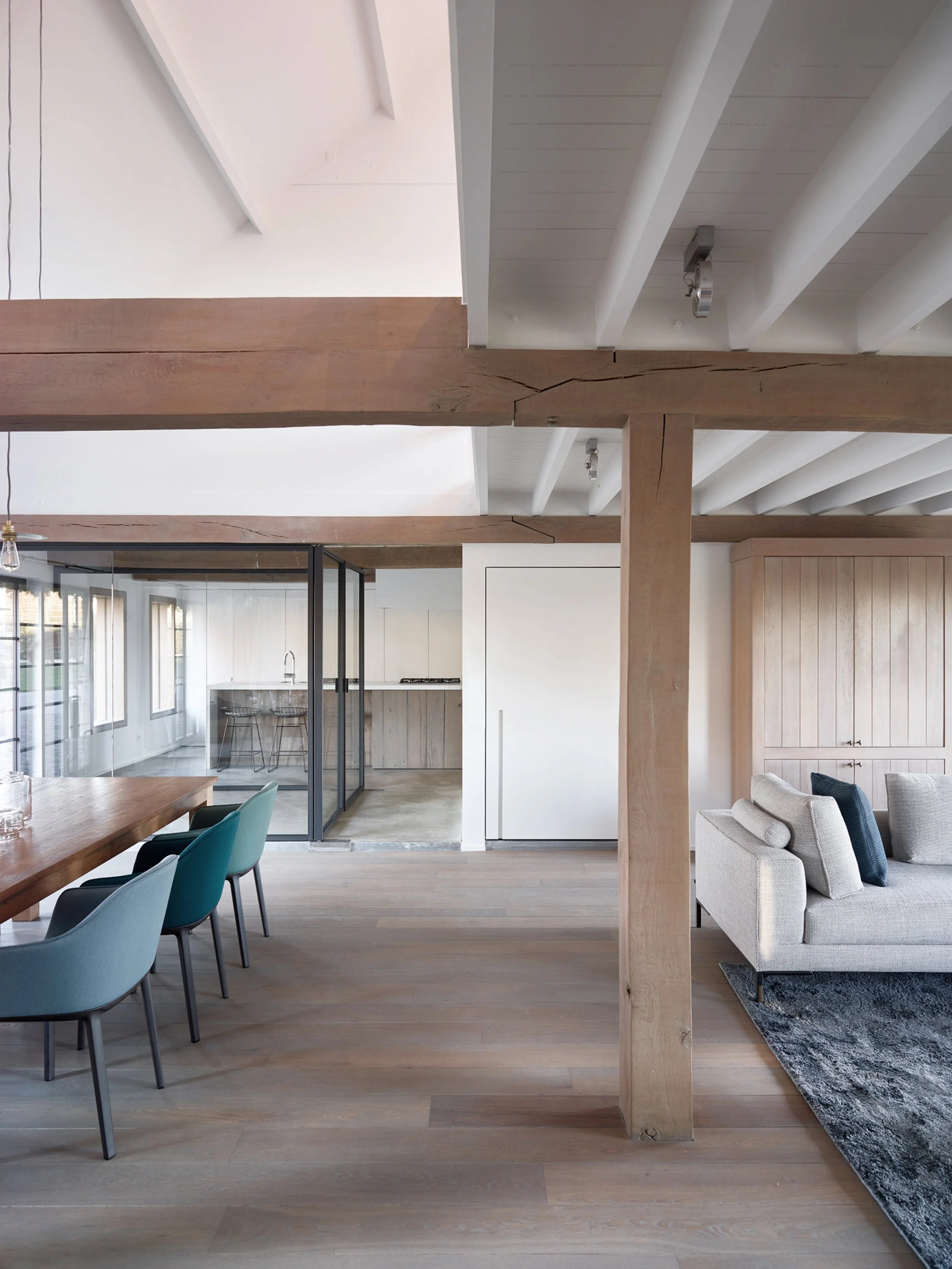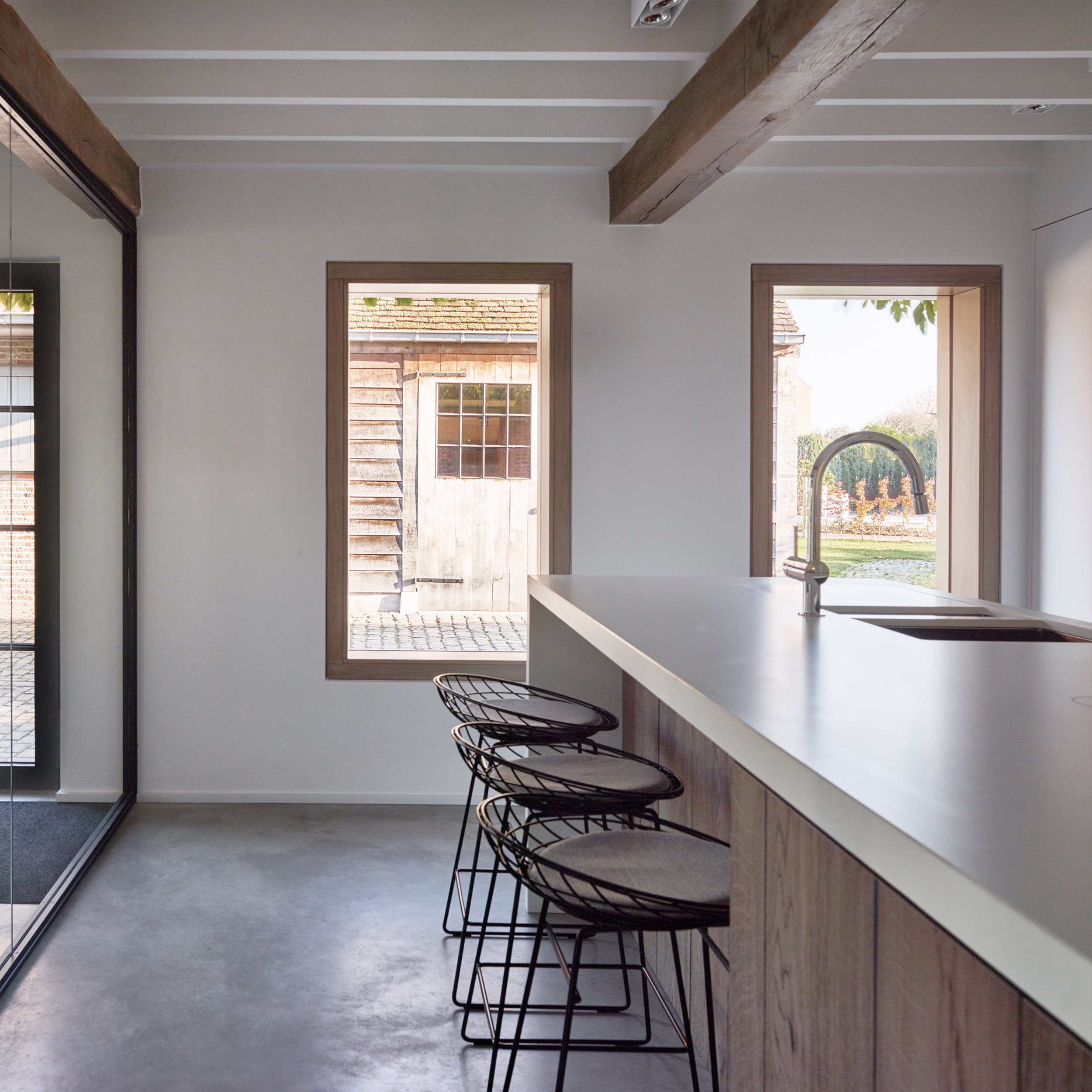 Verbouwing van een hoeve. Dit project is een hedendaagse interpretatie van een hoeve. Dankzij het openwerken van de verschillende ruimtes werd er extra licht gecreëerd. De grens tussen binnen en buiten vervaagd.