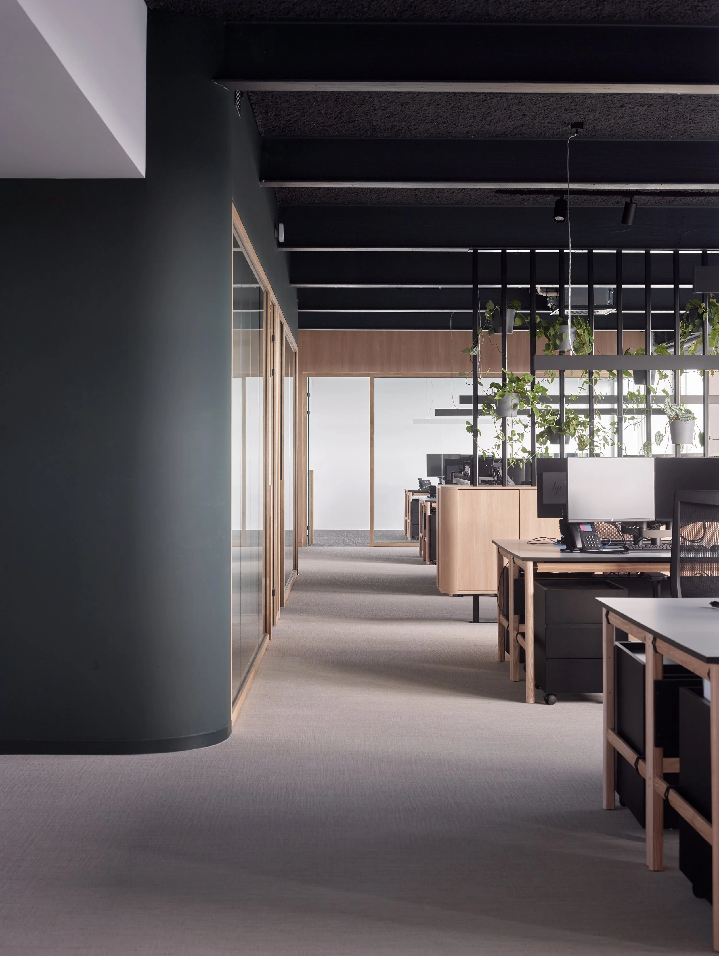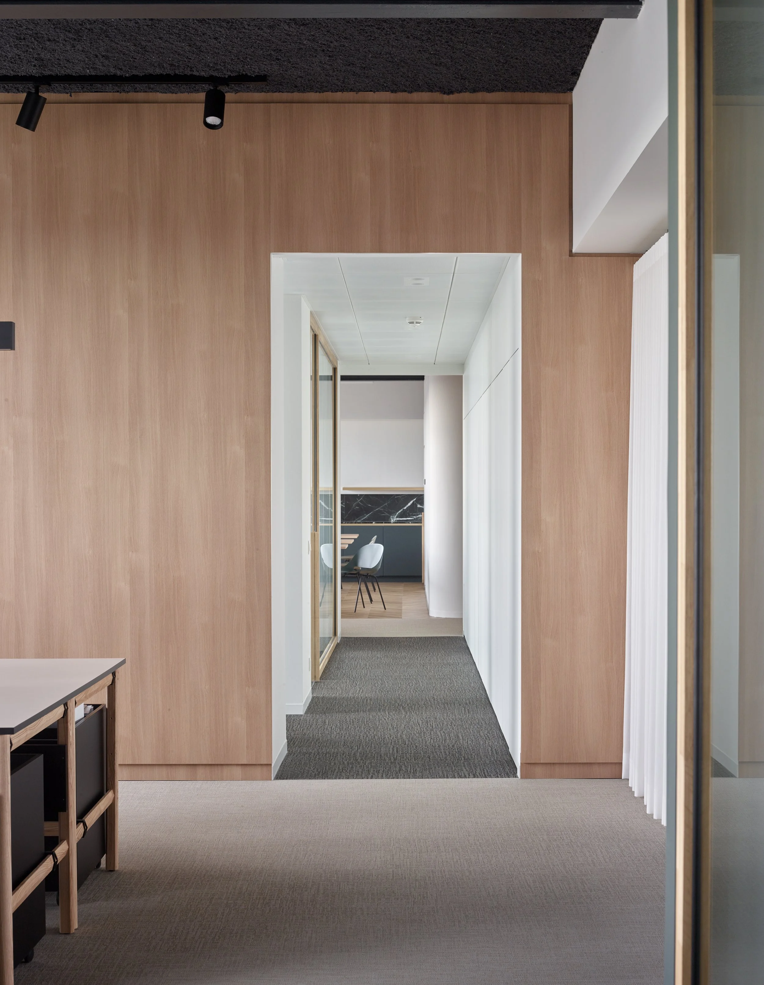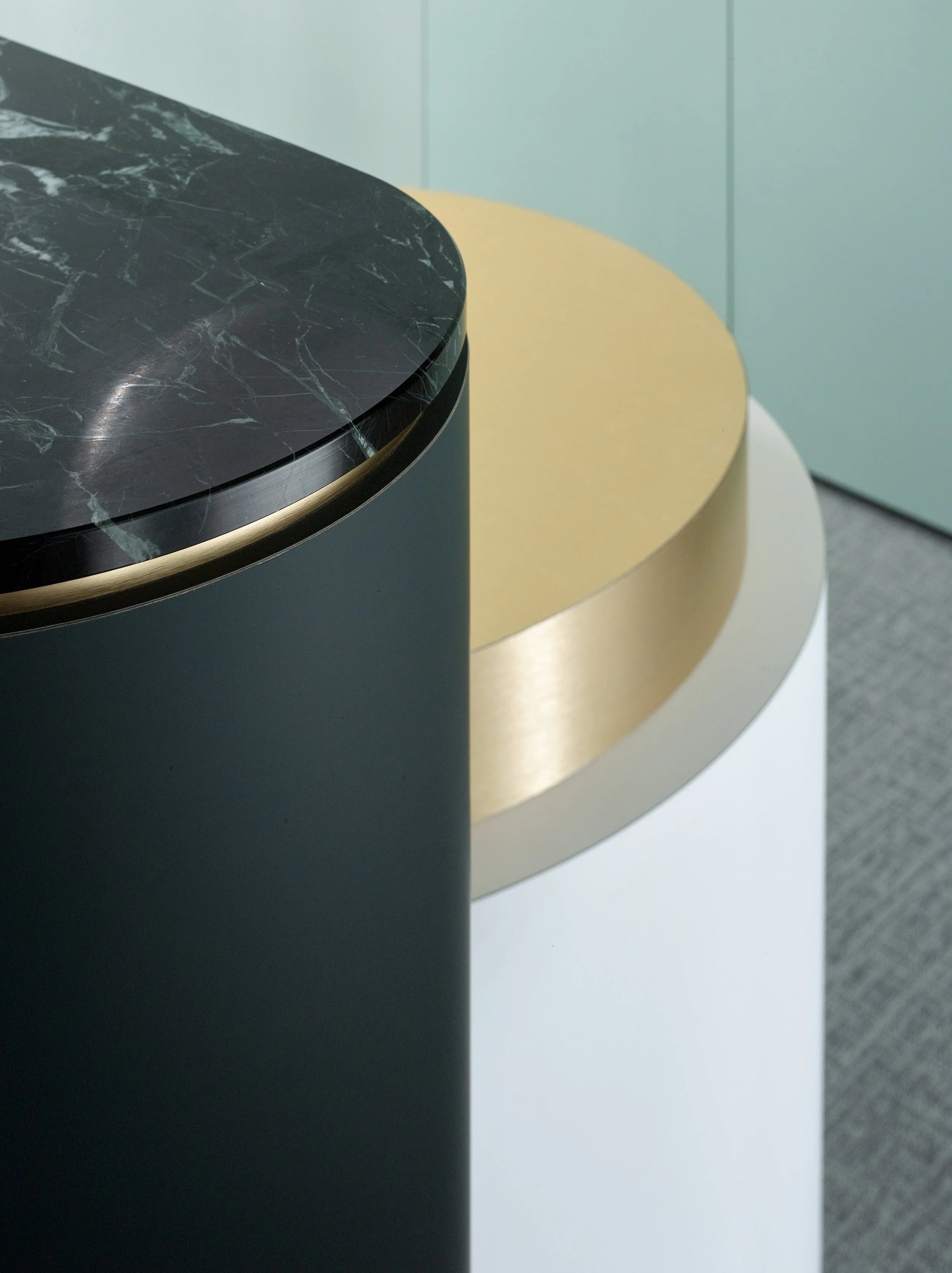 De open kantoorruimte slingert tussen verschillende volumes en combineert circulatie met werkplekken, wat zorgt voor een vloeiende ruimtelijkheid en stimuleert samenwerking. De afgeronde vormen en het gebruik van geborsteld goud geven de inrichting een verfijnde, tijdloze elegantie.