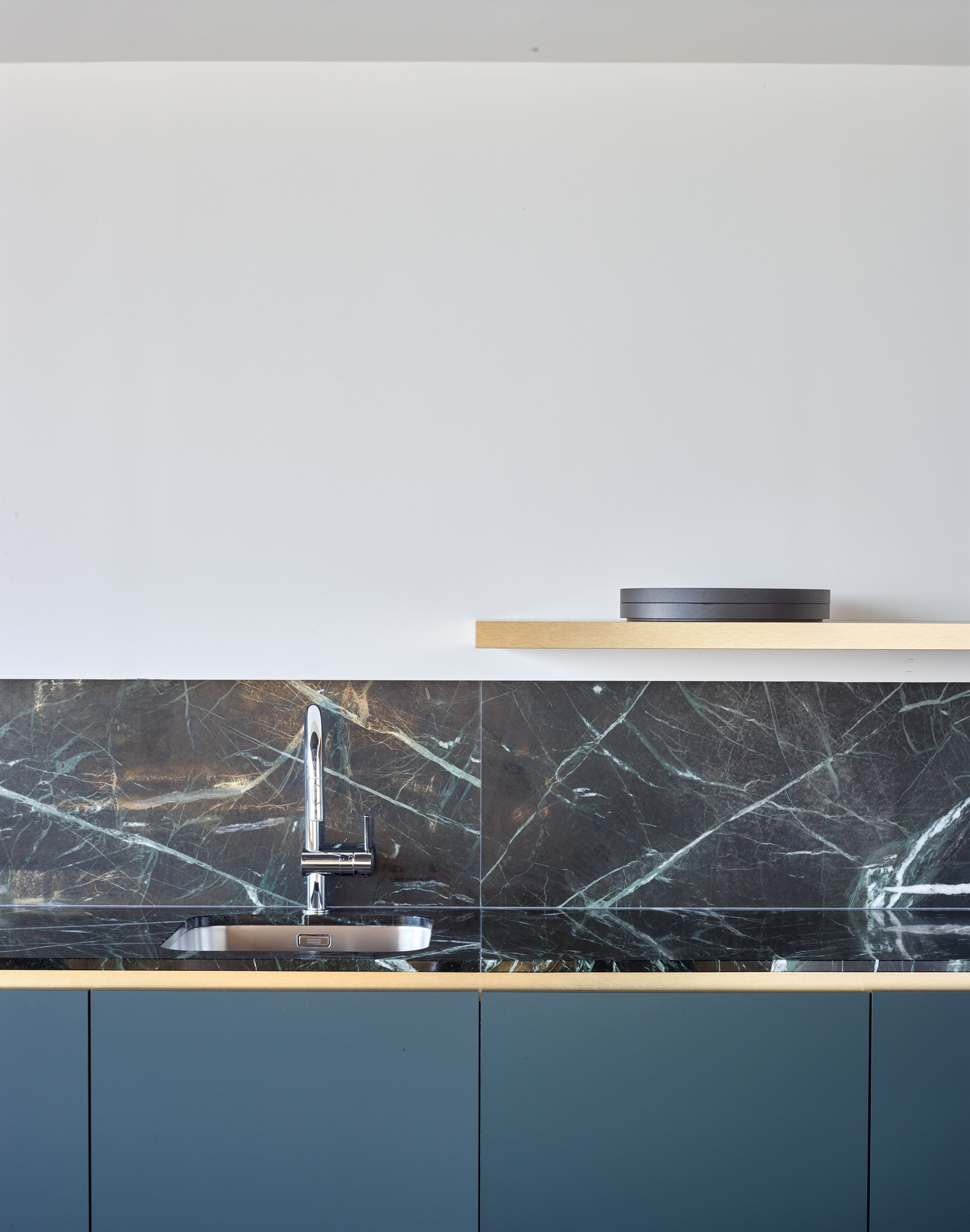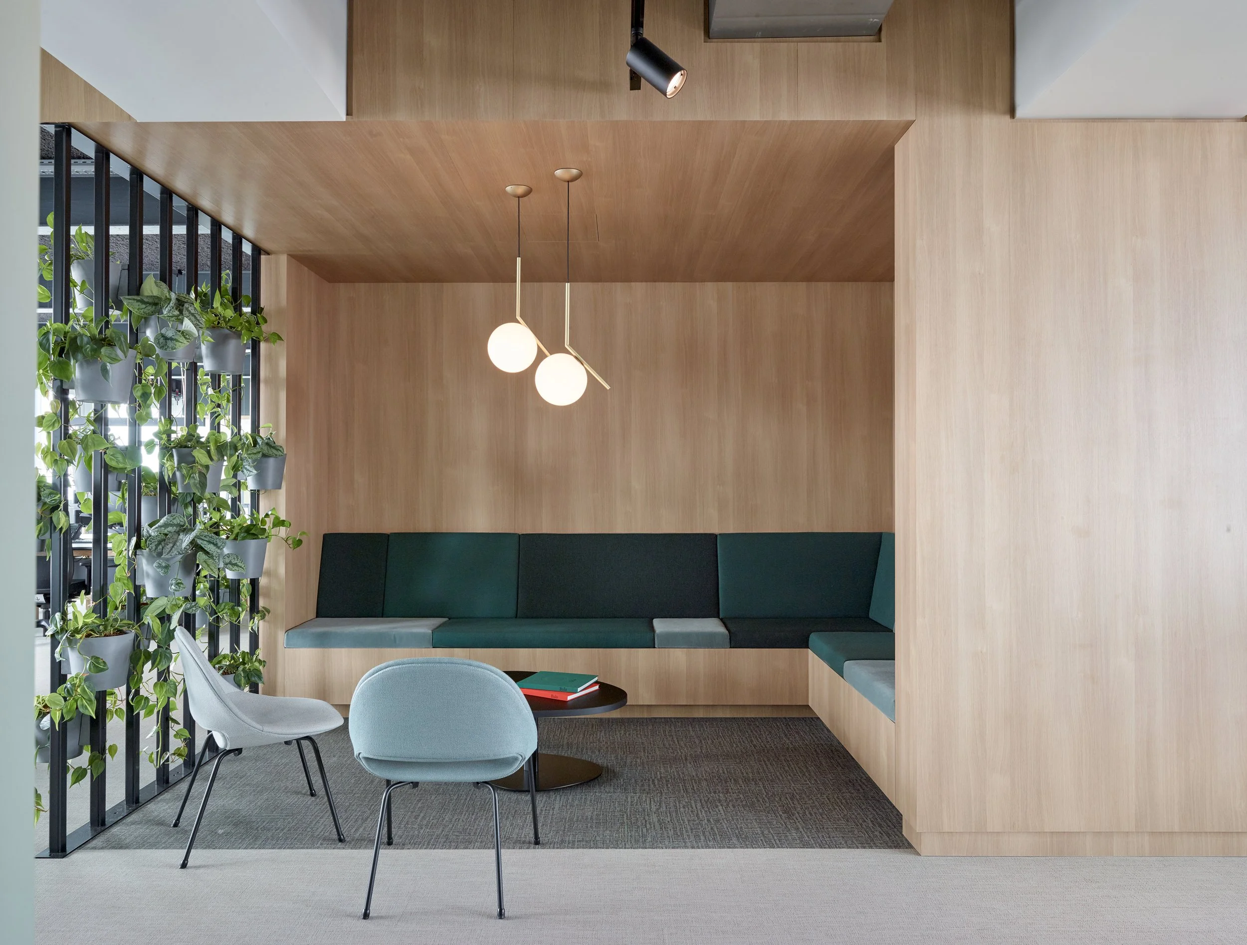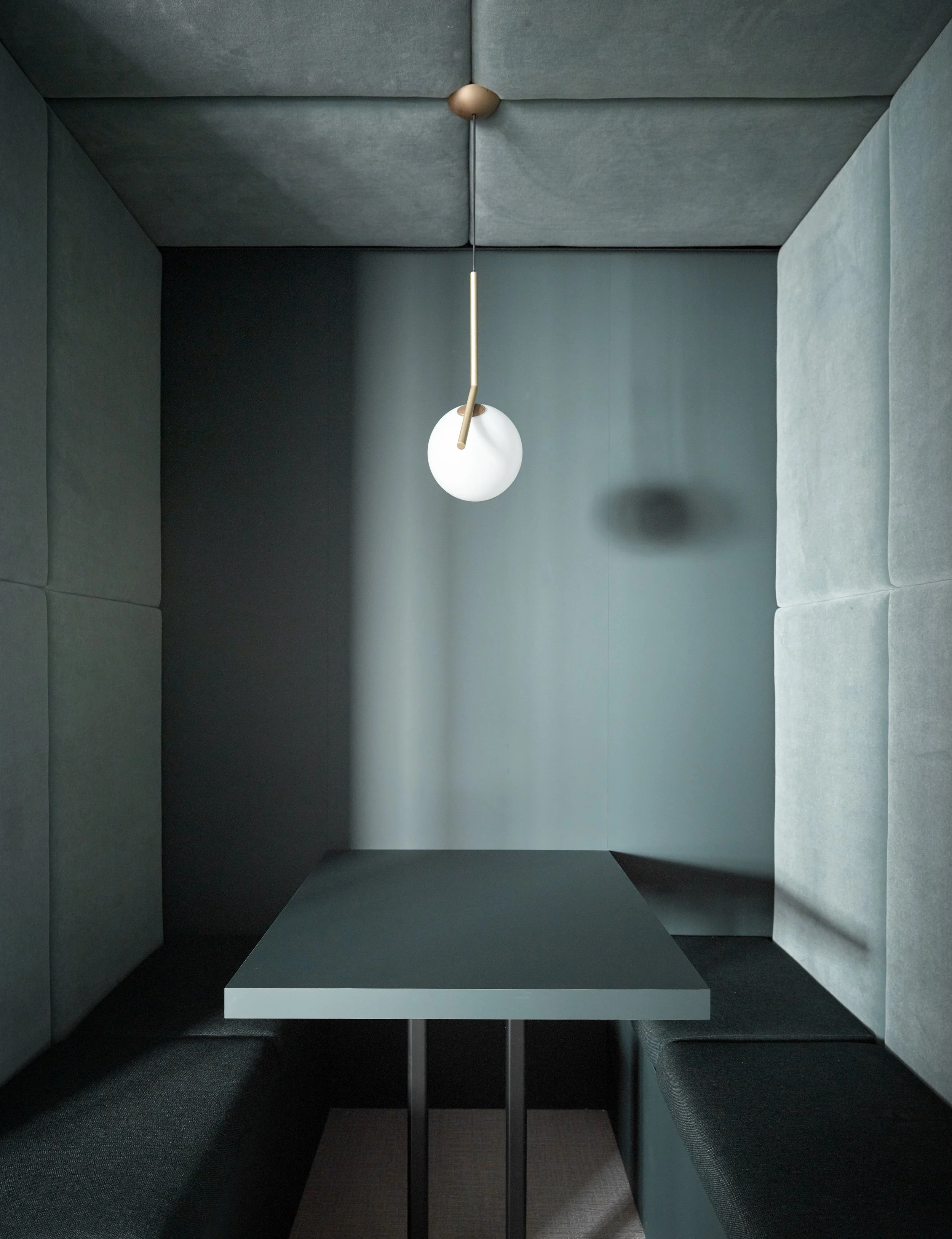 De open kantoorruimte slingert tussen verschillende volumes en combineert circulatie met werkplekken, wat zorgt voor een vloeiende ruimtelijkheid en stimuleert samenwerking. De afgeronde vormen en het gebruik van geborsteld goud geven de inrichting een verfijnde, tijdloze elegantie.